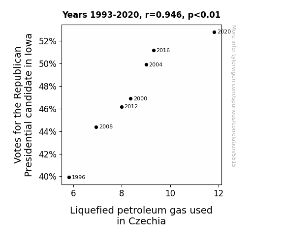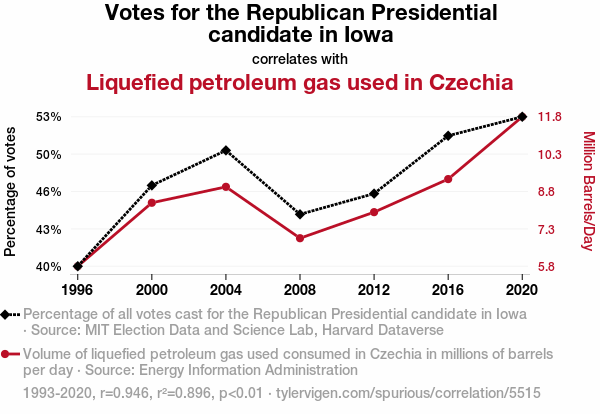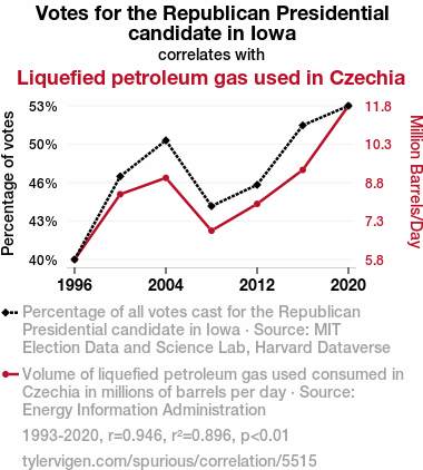 - The spurious research paper: Voting on the Rocks: A Flaming Correlation Between Republican Presidential Votes in Iowa and Liquefied Petroleum Gas Consumption in Czechia