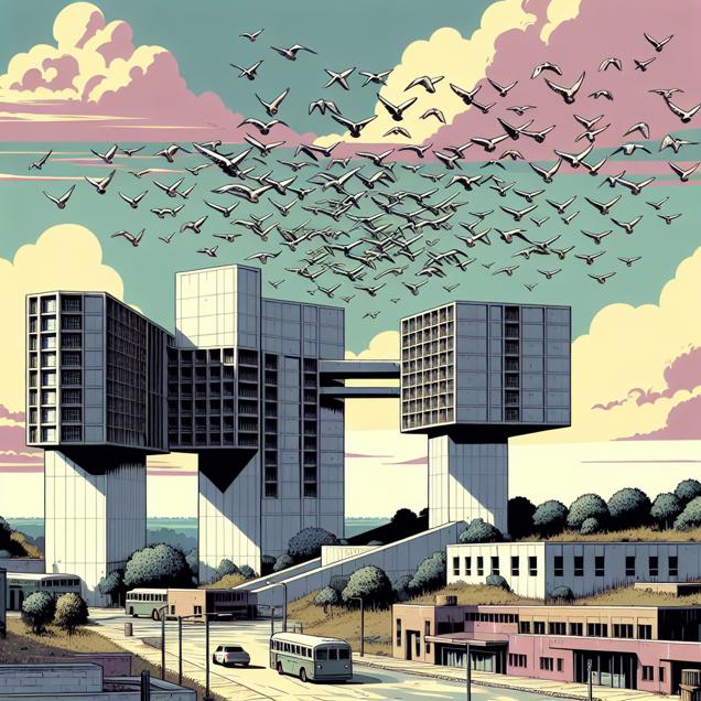Prompt: Image Generation Prompt: Style: Brutalism Scene: In Clarksville, Tennessee, the air cleared as the local bird population soared through the skies with newfound ease. Across the ocean in Saint Vincent/Grenadines, birds organized into a feathered air force, overseeing strict regulations on jet fuel usage. The unexpected collaboration left experts bewildered, raising questions about a potential shift in the global power dynamic to one dominated by birds. Enhanced Visual Prompt: Generate an image that depicts a stark, concrete urban landscape with monumental structures, where flocks of birds move through the sky with purpose and determination. The composition should emphasize the juxtaposition of the rigid, imposing architectural forms with the graceful flight of the birds, creating a sense of contrast and intrigue. Use a subdued color palette and strong geometric shapes to convey the essence of brutalism while highlighting the extraordinary phenomenon of avian coordination and dominance. The depiction should include only scenes, people, and objects, it should not include text or speech bubbles.