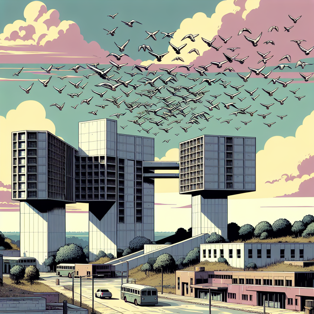 ChatGPT: Image Generation Prompt: Style: Brutalism Scene: In Clarksville, Tennessee, the air cleared as the local bird population soared through the skies with newfound ease. Across the ocean in Saint Vincent/Grenadines, birds organized into a feathered air force, overseeing strict regulations on jet fuel usage. The unexpected collaboration left experts bewildered, raising questions about a potential shift in the global power dynamic to one dominated by birds. Enhanced Visual Prompt: Generate an image that depicts a stark, concrete urban landscape with monumental structures, where flocks of birds move through the sky with purpose and determination. The composition should emphasize the juxtaposition of the rigid, imposing architectural forms with the graceful flight of the birds, creating a sense of contrast and intrigue. Use a subdued color palette and strong geometric shapes to convey the essence of brutalism while highlighting the extraordinary phenomenon of avian coordination and dominance.