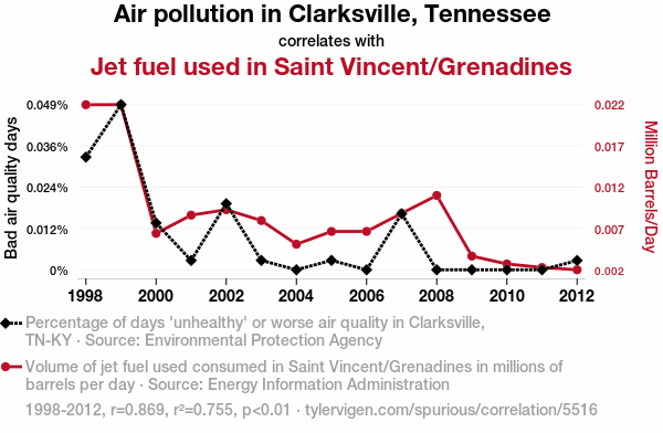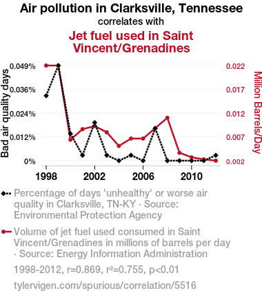 - The spurious research paper: Up in the Air: Exploring the Interplay between Air Pollution in Clarksville, Tennessee, and Jet Fuel Usage in Saint Vincent/Grenadines