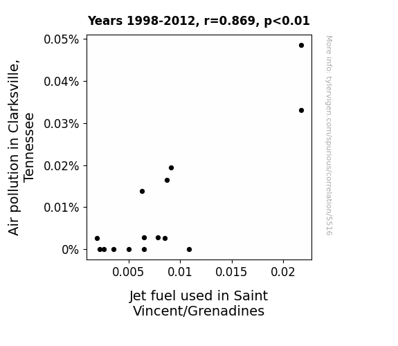 This means 75.5% of the change in the one variable (i.e., Jet fuel used in Saint Vincent/Grenadines) is predictable based on the change in the other (i.e., Air pollution in Clarksville, Tennessee) over the 15 years from 1998 through 2012.