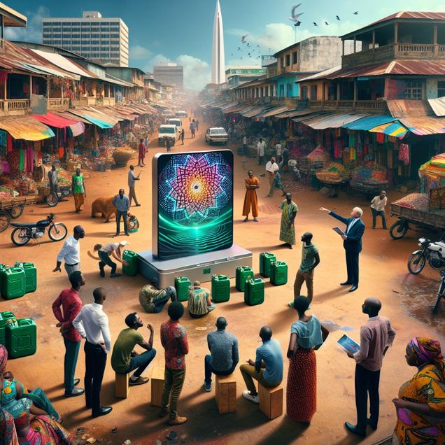 Prompt: Generate an imagery using the style of [a funny image you would see on reddit]: Create an image of a bustling market square in Monrovia, Liberia, with a group of excited engineers and researchers gathered around a large screen displaying mesmerizing geometric patterns from Vihart's YouTube channel. In the foreground, there's a towering stack of jerrycans filled with eco-friendly jet fuel, symbolizing Liberia's leadership in sustainable air travel. The scene captures the unexpected intersection of art, mathematics, and eco-friendly technology. The depiction should include only scenes, people, and objects, it should not include text or speech bubbles.