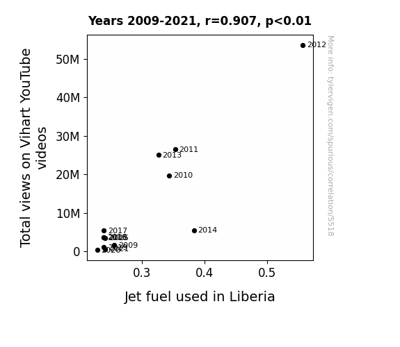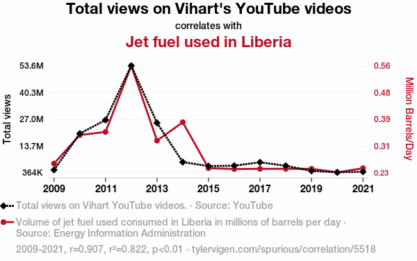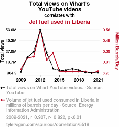 This means 82.2% of the change in the one variable (i.e., Jet fuel used in Liberia) is predictable based on the change in the other (i.e., Total views on Vihart's YouTube videos) over the 13 years from 2009 through 2021.