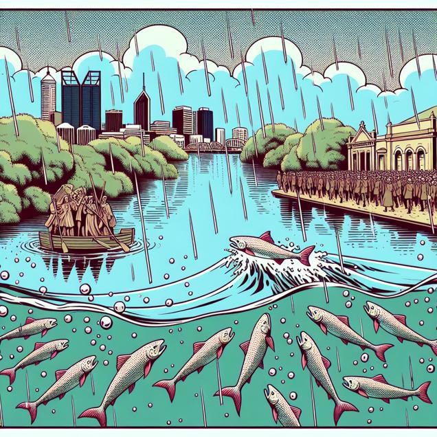 User prompt: Please describe a visual scene that prominently depicts both Rain in Perth and Votes for Libertarian Senators in Alabama, in the following situation: The rain in Perth is actually a secret government experiment to promote independent thinking, leading to an increase in support for Libertarian candidates in far-off places like Alabama. How? Well, the rainwater is subtly infused with a belief in personal freedom and limited government, which is then carried across the ocean by, you guessed it, specially trained libertarian salmon. These politically enlightened fish make their way to the rivers of Alabama, where they tirelessly advocate for individual rights and the free market, ultimately swaying the senatorial election in favor of the Libertarians. It's a truly drip-down effect of aquatic activism!. Keep the description simple.