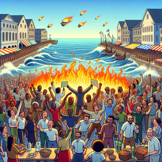 Prompt: An image that looks like it is a scene from a Pixar movie, where in Rhode Island, a group of diverse people are shown proudly casting their votes in a picturesque town square. Their enthusiasm for the Libertarian Presidential candidate is depicted through colorful banners and their joyful expressions. As the excitement ignites, vibrant flames of passion and hope are seen flickering around them, symbolizing the energy of their political conviction. Simultaneously, the scene seamlessly transitions across the ocean to Haiti, presenting a lively marketplace where locals are joyfully embracing the use of Liquefied Petroleum Gas (LPG) as an alternative fuel. The vivid colors of the market and the enthusiasm of the locals contrast with the serene ocean backdrop. The connection between political ideology and clean-burning fuel usage becomes evident as the energy of liberty and smaller government in Rhode Island translates into positive change in Haiti, represented by sparkling waves of transformative energy reaching the island. This visual representation conveys the interconnectedness between political action and environmental progress with a touch of animated charm and emotional depth. The depiction should include only scenes, people, and objects, it should not include text or speech bubbles.