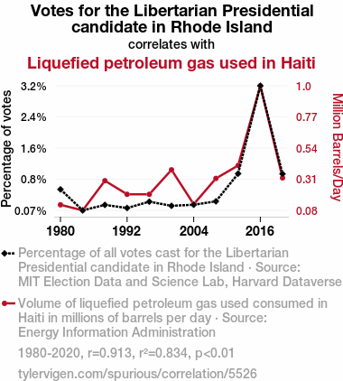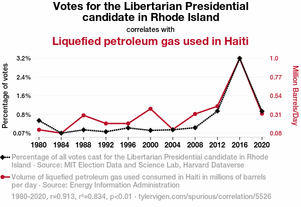 User prompt: Please provide potential search keywords for a paper titled Rhode Island Vote for Libertarian Might Elevate Haiti's Propane Fête with an abstract of This paper scrutinizes the intriguing relationship between votes for the Libertarian presidential candidate in Rhode Island and the consumption of liquefied petroleum gas in Haiti. Leveraging data from the MIT Election Data and Science Lab, Harvard Dataverse, and the Energy Information Administration, we embarked on a rigorous investigation into this seemingly disparate connection. Upon meticulous analysis, a notable correlation coefficient of 0.9133838 and a statistically significant p-value of less than 0.01 emerged for the period spanning from 1980 to 2020. Our findings not only shed light on this enigmatic nexus but also hint at the potential for unexpected linkages in the realm of political and energy dynamics.