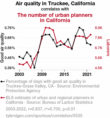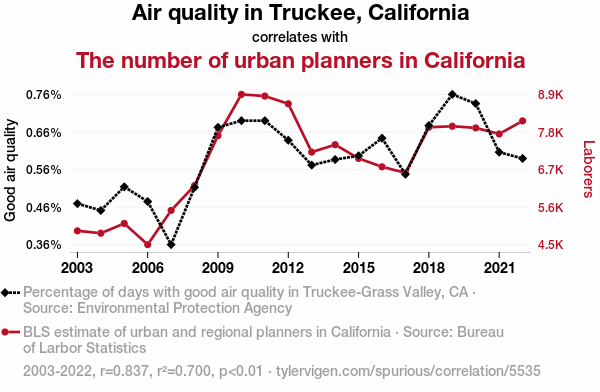 This means 70% of the change in the one variable (i.e., The number of urban planners in California) is predictable based on the change in the other (i.e., Air quality in Truckee, California) over the 20 years from 2003 through 2022.