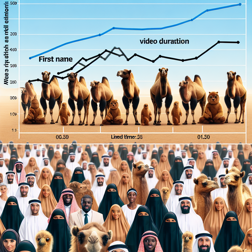 Prompt: Generate an image where the chart labeled "Popularity of the First Name Camden" exhibits a declining trend, while the adjacent chart titled "Total Length of LEMMiNO YouTube Videos" also displays a shorter line indicating decreased video length. In the background, include a playful montage of popular camel-adorable content flashing across the screen, captivating a diverse audience. The depiction should include only scenes, people, and objects, it should not include text or speech bubbles.