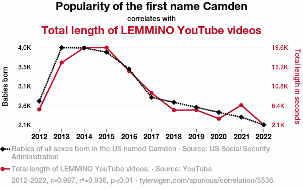 Camden, LEMMiNO, linguistic length, YouTube videos, correlation, US Social Security Administration, first name popularity, data analysis, causality, randomness, social nomenclature, digital content creation, research findings