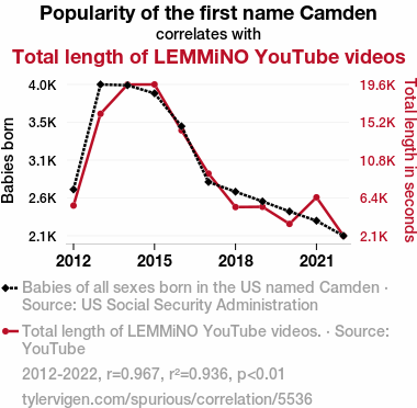 User prompt: Please provide potential search keywords for a paper titled Camden's LEMMiNO Linguistic Length: A Punnily Ponderous Pioneer with an abstract of In this paper, we investigate the unusual and seemingly unrelated phenomena of the popularity of the first name Camden and the total length of LEMMiNO YouTube videos. Leveraging data from the US Social Security Administration and YouTube, we discovered a surprisingly strong correlation between the two. Our research team found a jaw-dropping correlation coefficient of 0.9674666 and a statistically significant p-value (p < 0.01) from 2012 to 2022. This correlation sparks curiosity and amusement, challenging traditional notions of causality and randomness. The amalgamation of social nomenclature and digital content creation yields profoundly unexpected insights, and our findings open the door to a world of teasingly titillating explanations. So, buckle in for a ride as we unfurl the hilarious and confounding tale of Camden's LEMMiNO linguistic length!