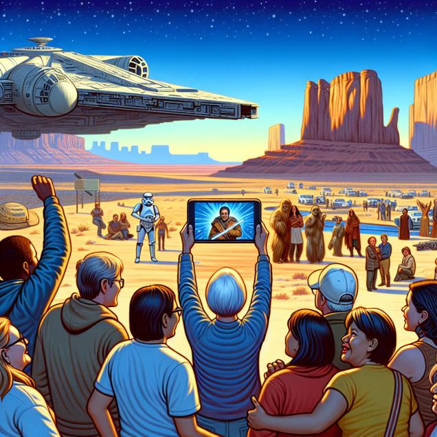 Prompt: Generate an image that recreates a scene from 'Star Wars' set in the backdrop of Albuquerque with an improved air quality. The clear blue skies reveal a contented city where people take deep breaths freely. In the foreground, a group of individuals gather around a smartphone, watching a captivating LEMMiNO YouTube video, eliciting a sense of engagement and appreciation among the viewers. The depiction should include only scenes, people, and objects, it should not include text or speech bubbles.