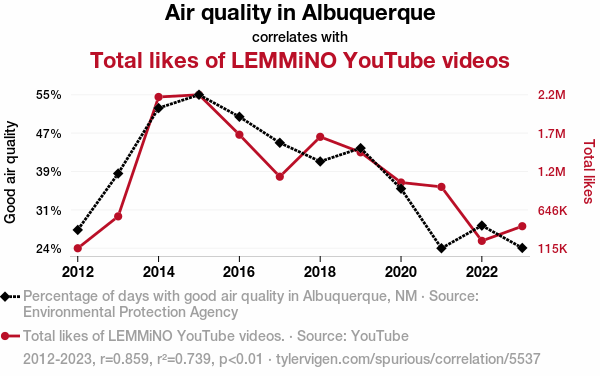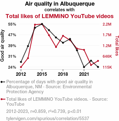 A linear line chart with years as the X-axis and two variables on the Y-axis. The first variable is Air quality in Albuquerque and the second variable is Total likes of LEMMiNO YouTube videos.  The chart goes from 2012 to 2023, and the two variables track closely in value over that time. Small Image