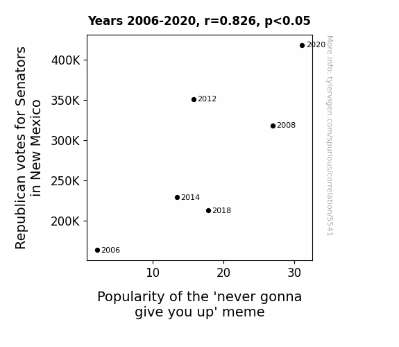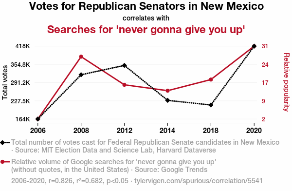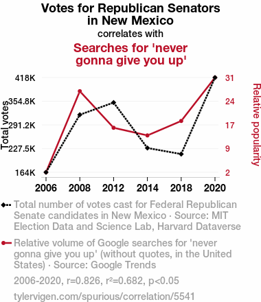 - The spurious research paper: Never Gonna Give New Mexico Up: An Unlikely Correlation Between Republican Votes for Senators and the Popularity of the 'Never Gonna Give You Up' Meme