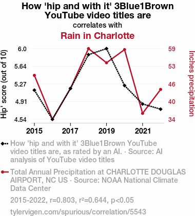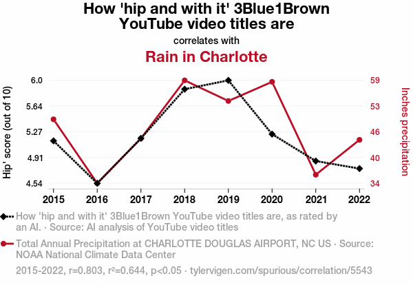 User prompt: Please make up a funny explanation for how a decrease in How 'hip and with it' 3Blue1Brown YouTube video titles are caused Rain in Charlotte to decrease. Make it feel plausible.