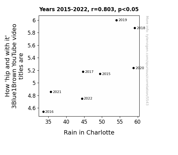 This means 64.4% of the change in the one variable (i.e., Rain in Charlotte) is predictable based on the change in the other (i.e., How 'hip and with it' 3Blue1Brown YouTube video titles are) over the 8 years from 2015 through 2022.