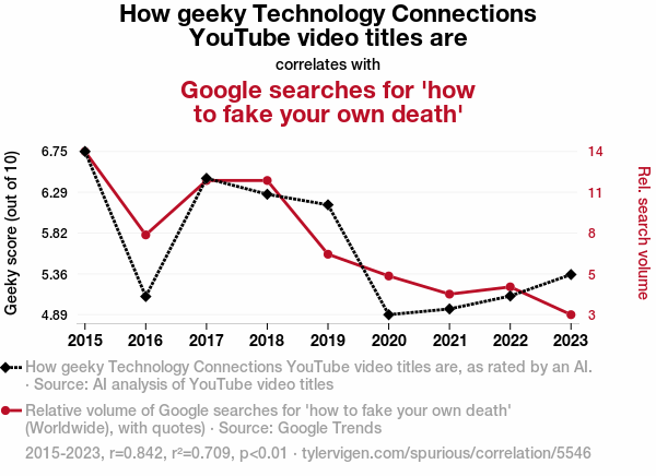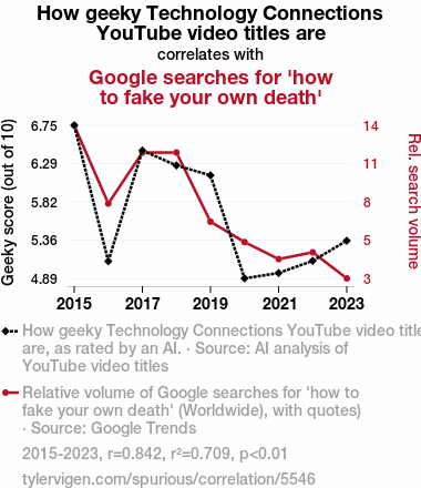 This means 70.9% of the change in the one variable (i.e., Google searches for 'how to fake your own death') is predictable based on the change in the other (i.e., How geeky Technology Connections YouTube video titles are) over the 9 years from 2015 through 2023.