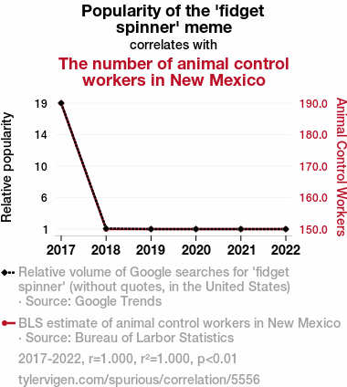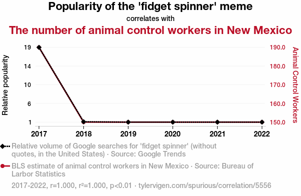 This means 100% of the change in the one variable (i.e., The number of animal control workers in New Mexico) is predictable based on the change in the other (i.e., Popularity of the 'fidget spinner' meme) over the 6 years from 2017 through 2022.