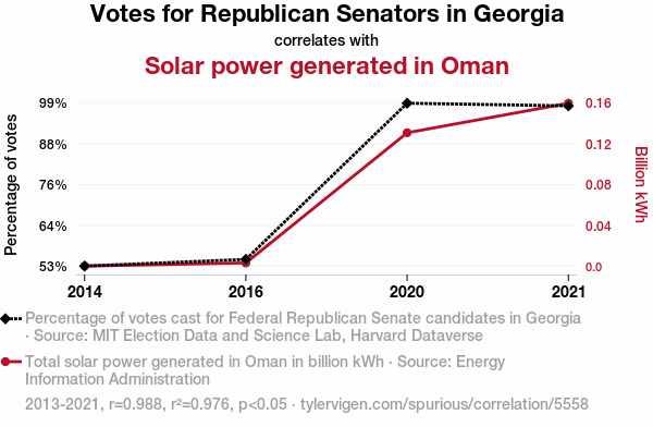 This means 97.6% of the change in the one variable (i.e., Solar power generated in Oman) is predictable based on the change in the other (i.e., Votes for Republican Senators in Georgia) over the 4 years from 2013 through 2021.