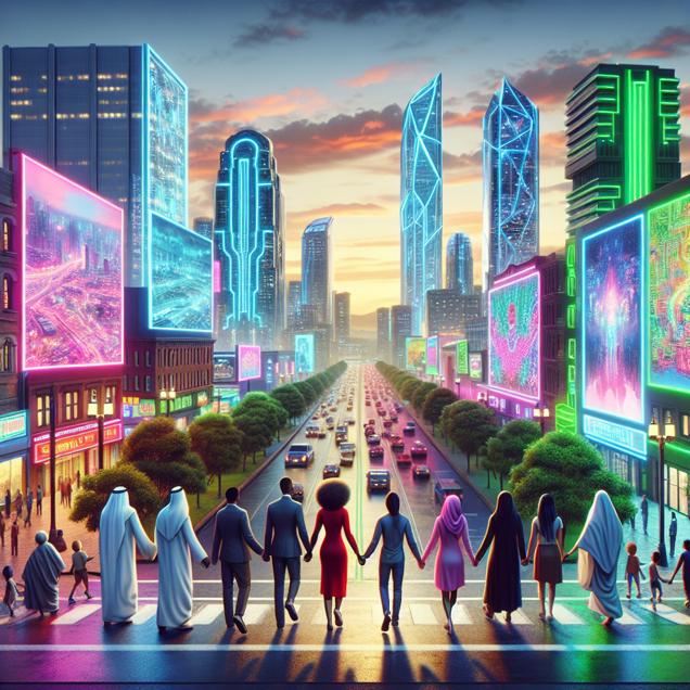 ChatGPT: Generate an image of a cyberpunk-inspired scene set in Bowling Green, Kentucky. The environment is a futuristic cityscape, enhanced by neon lights and holographic billboards. In the foreground, couples are strolling hand in hand through the revitalized streets lined with technologically advanced buildings. The atmosphere showcases a refreshing contrast of nature reclaiming the urban space, with vibrant greenery and clean air permeating the city. The couples are portrayed engaged in intimate conversations, amid a setting that exudes a sense of revitalization and renewed connection.
