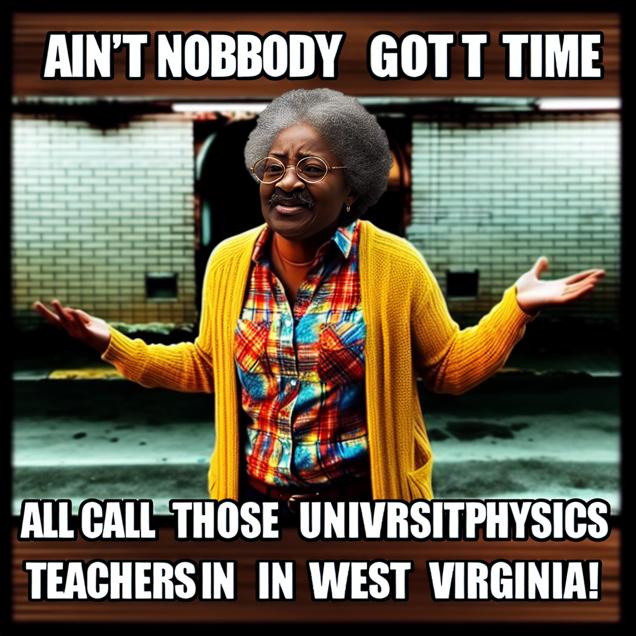 Create a meme inspired by the aint nobody got time for that meme that in some way references The number of university physics teachers in West Virginia. Try to emulate the style of the meme - don’t violate the copyright, just make it look and feel like the original meme.
