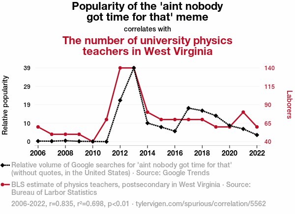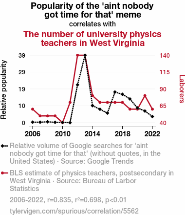 User prompt: Please provide potential search keywords for a paper titled Ain't Nobody Got Time for That: The Correlation Between the Popularity of a Meme and the Number of Physics Teachers in West Virginia Universities with an abstract of This paper investigates the possible connection between the prevalence of the "ain't nobody got time for that" meme and the employment of university physics teachers in the state of West Virginia. Utilizing data from Google Trends and the Bureau of Labor Statistics spanning from 2006 to 2022, our research team has observed a significant correlation coefficient of 0.8353062 with p < 0.01. While our findings point to a surprising potential association, it is crucial to approach the interpretation with scientific caution and a healthy dose of humor. We discuss the implications of our results within the context of meme culture and the academic workforce, while acknowledging the light-hearted nature of our inquiry.