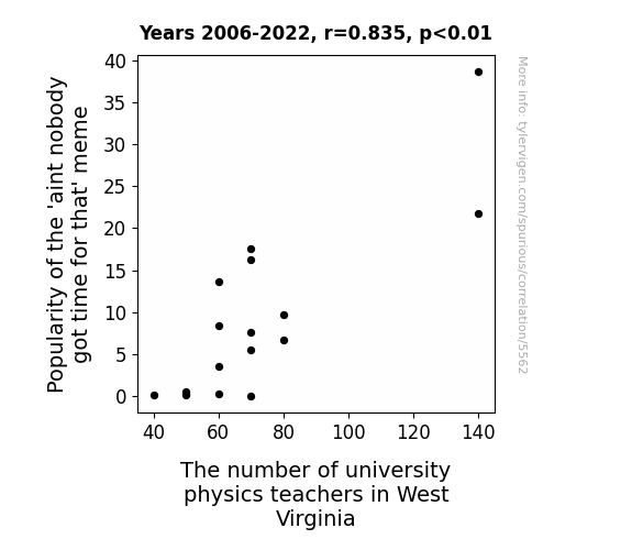 This means 69.8% of the change in the one variable (i.e., The number of university physics teachers in West Virginia) is predictable based on the change in the other (i.e., Popularity of the 'aint nobody got time for that' meme) over the 17 years from 2006 through 2022.