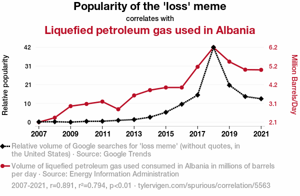 User prompt: Please provide potential search keywords for a paper titled Gasoline and Chagrin: The LPG Connection to the Loss Meme's Ascension with an abstract of The rise of the 'loss' meme on the internet has been as puzzling as a jigsaw missing its final piece, leaving us with an incomplete picture of its origins and influence. In a bizarre turn of events, this study delves into the correlation between the popularity of the 'loss' meme and the consumption of Liquefied Petroleum Gas (LPG) in Albania. Our research team embarked on this unconventional journey, utilizing data from Google Trends to gauge the viral nature of the meme and data from the Energy Information Administration to track LPG usage. Surprisingly, our analysis revealed a correlation coefficient of 0.8910737, leaving us gasping in disbelief at the unexpected link between internet humor and household fuel preferences. The findings of this study not only shed light on the enigmatic allure of the 'loss' meme but also ignite a flame of curiosity, prompting further investigation into the whimsical intersections of internet culture and everyday phenomena. Who knew that the 'loss' meme and LPG would join forces in a synergy as peculiar as a jesting jester juggling jet fuel?