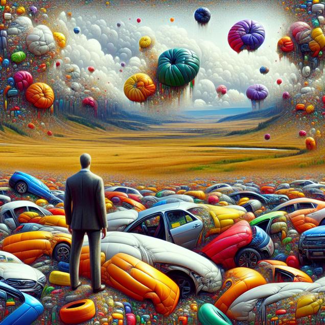 Prompt: Generate an image of a TIME magazine cover in the style of DALLE-3, featuring a striking and somewhat surreal scene. Picture a North Dakota landscape with rolling plains, and in the foreground, an explosion of colorful cars bursting from their airbags in a seemingly anarchic fashion. A lone figure representing the Libertarian Presidential candidate stands amidst the chaos, observing the automotive rebellion with an enigmatic expression. The composition should convey the clash between political idealism and automotive safety in a visually compelling and thought-provoking manner. The depiction should include only scenes, people, and objects, it should not include text or speech bubbles.