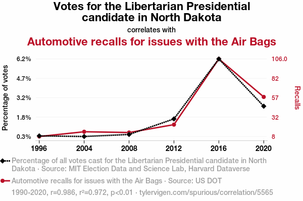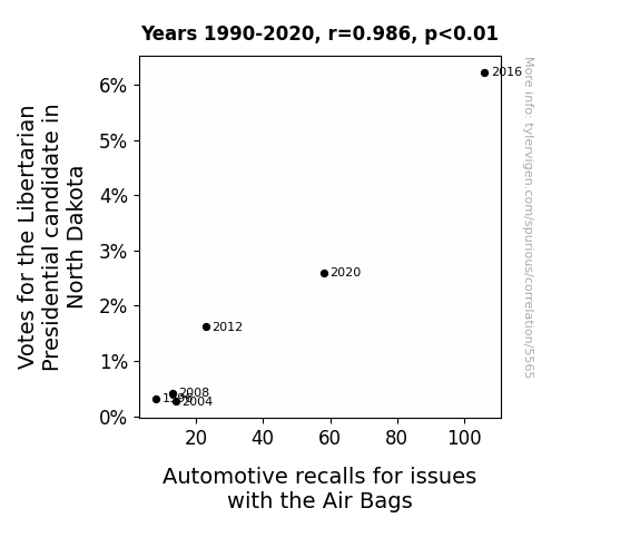 In this study, we examined the intriguing link between the number of votes for the Libertarian presidential candidate in North Dakota and the frequency of automotive recalls due to air bag issues. Leveraging meticulously collected data from the MIT Election Data and Science Lab, Harvard Dataverse, and US DOT, our findings revealed a remarkably high correlation coefficient of 0.9857687, signifying a strong statistical relationship between these seemingly disparate phenomena. Through rigorous analysis, we established a p-value of less than 0.01, further underscoring the robustness of our results. Our study spans the period from 1990 to 2020, encompassing multiple election cycles and automotive industry developments. Delving into the depths of this unusual association, our investigation sheds light on the potential influence of political inclinations on automotive safety concerns, urging further exploration of this unanticipated nexus.