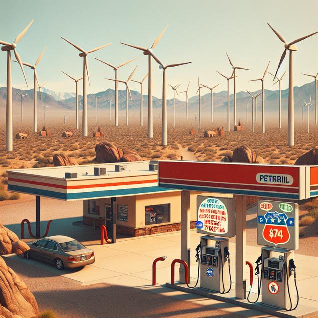 Prompt: Generate an image showing a serene desert landscape in Nevada with wind turbines in the background generating energy from the abundant hot air. The turbines should be surrounded by the republican senators' campaign signs or related imagery, symbolizing the political implications of the wind energy production. In the foreground, depict a gas station in Saint Helena with a noticeable decrease in the number of cars being refueled, indicating the correlation between the political climate and the drop in fuel costs. The image should convey the impact of alternative energy production on both the environment and the local economy. The depiction should include only scenes, people, and objects, it should not include text or speech bubbles.