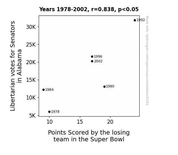 As the Libertarian votes for Senators in Alabama increased, so did the losing team's Points Scored in the Super Bowl. It seems that the push for individual freedom and limited government had a ripple effect on the football field. You could say the losing team was really vying for that "free"dom to score!