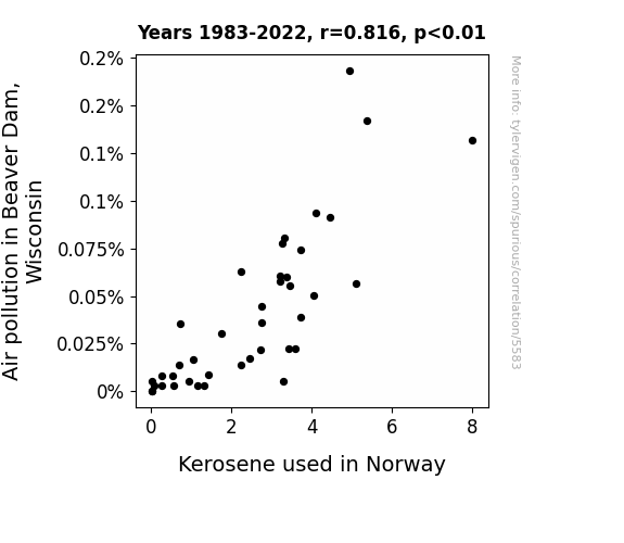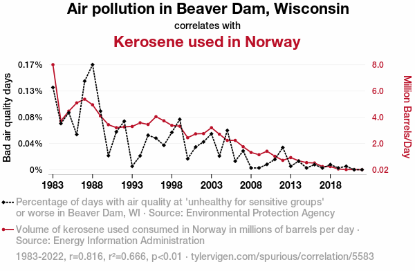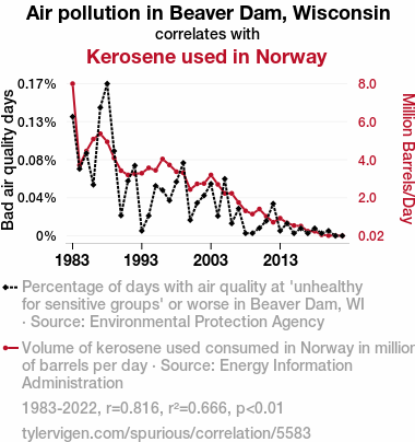 - The spurious research paper: The Relationship Between Air Pollution in Beaver Dam, Wisconsin and Kerosene Consumption in Norway: A Cross-country Analysis