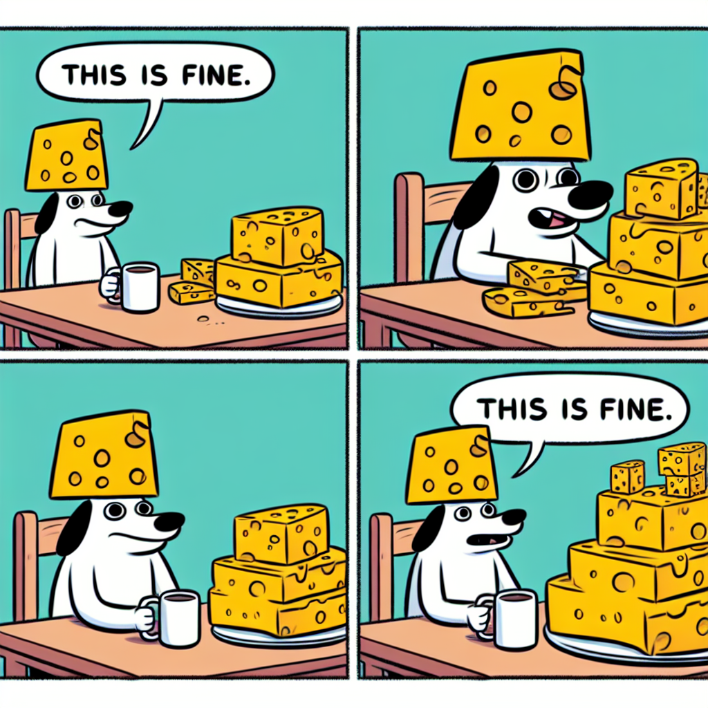 Create a meme inspired by the this is fine meme that in some way references American cheese consumption. Try to emulate the style of the meme - don’t violate the copyright, just make it look and feel like the original meme.