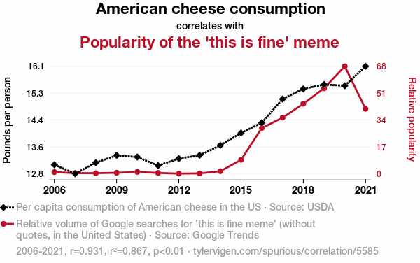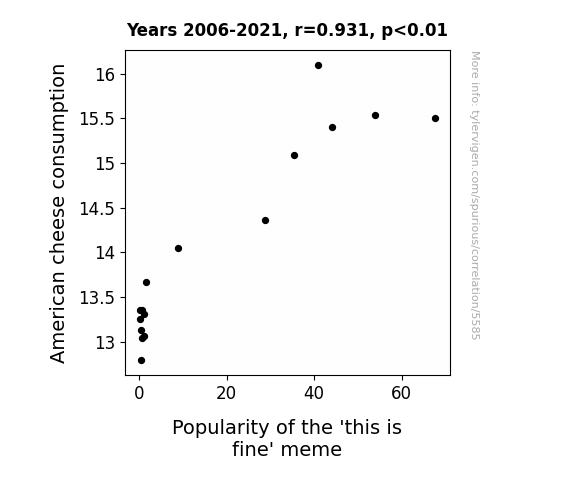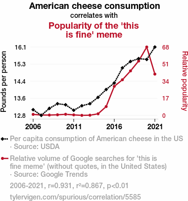- The spurious research paper: Chomping on Cheddar: The Curious Correlation Between American Cheese Consumption and the 'This is Fine' Meme