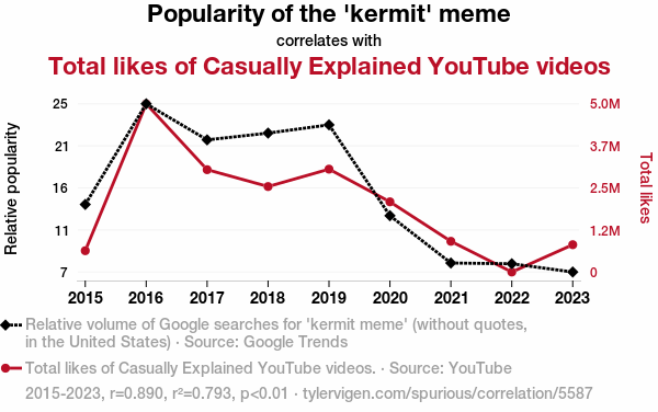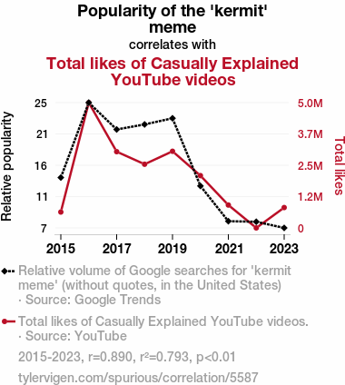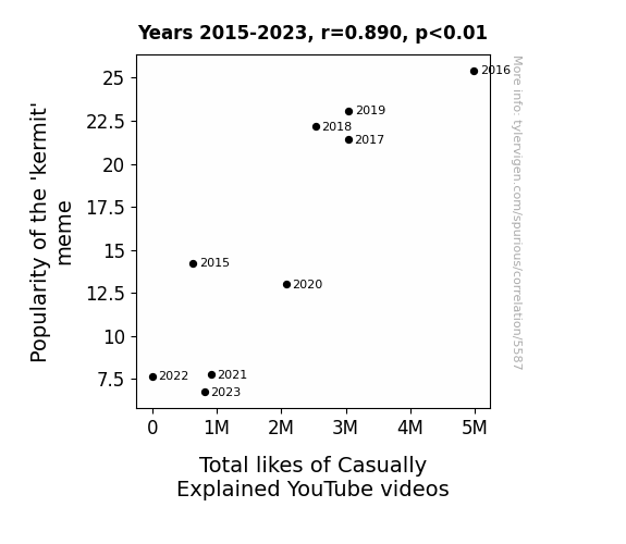 This research explores the relationship between the popularity of the 'kermit' meme and the total likes of Casually Explained YouTube videos. We utilized data from Google Trends and YouTube to investigate this pressing matter. Our findings revealed a remarkably high correlation coefficient of 0.8902794 and a statistically significant p-value of less than 0.01 for the period spanning from 2015 to 2023.