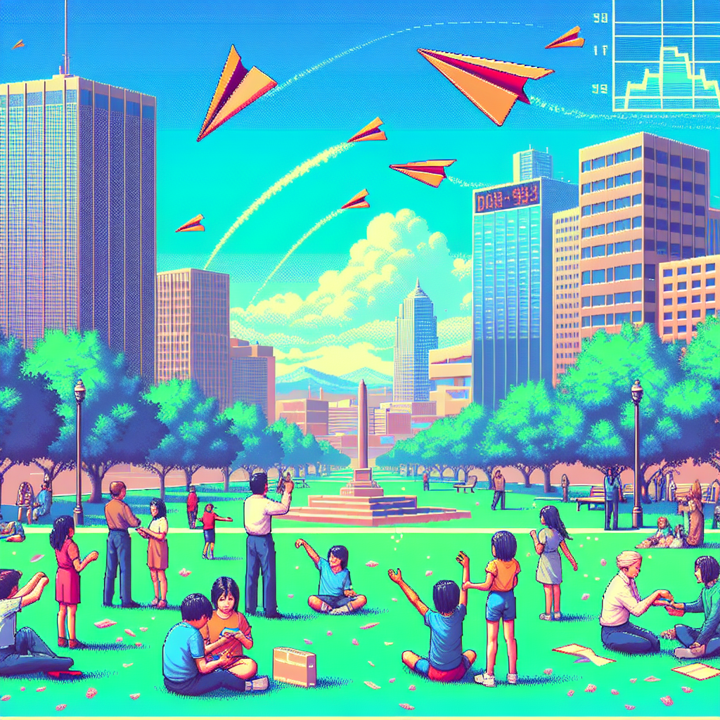 User prompt: Please respond with an image generation prompt that would be likely to create an interesting visual using DALLE-3, using the following style: [ Vaporwave ] and depicting this scene: A clear blue sky hangs over Deming, New Mexico. The residents, full of renewed energy, gather in a park, making and flying paper airplanes. Their laughter and cheers fill the air as the paper shortage grows. Meanwhile, in the city, the stock price of NatWest Group (NWG) drops on the paper assets dwindling due to the surge in paper demand. Keep the visual depiction simple. Do not include any words or speech bubbles.