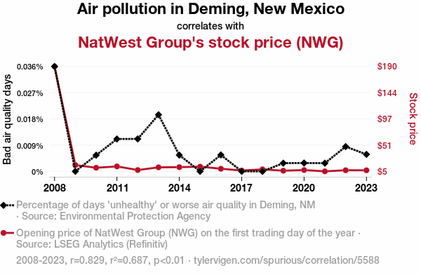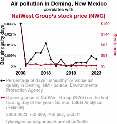 A linear line chart with years as the X-axis and two variables on the Y-axis. The first variable is Air pollution in Deming, New Mexico and the second variable is NatWest Group's stock price (NWG).  The chart goes from 2008 to 2023, and the two variables track closely in value over that time. Small Image