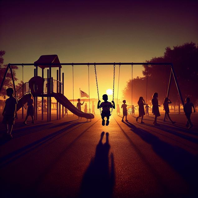 Prompt: Generate an image of a playground at twilight, with Lance alone on a swing set in the foreground. The setting sun casts a melancholic light over the scene. In the distance, a group of friends is gradually dispersing, leaving Lance behind. A banner for the Republican candidate in Maryland is being taken down, symbolizing the diminishing support for the candidate. The slide on the playground reflects the dwindling popularity of the name Lance, mirroring the declining support for the candidate's votes. The depiction should include only scenes, people, and objects, it should not include text or speech bubbles.