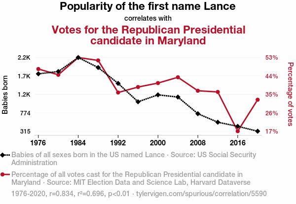A linear line chart with years as the X-axis and two variables on the Y-axis. The first variable is Popularity of the first name Lance and the second variable is Votes for the Republican Presidential candidate in Maryland.  The chart goes from 1976 to 2020, and the two variables track closely in value over that time. Small Image