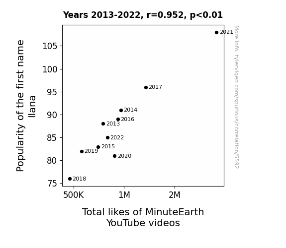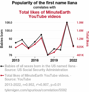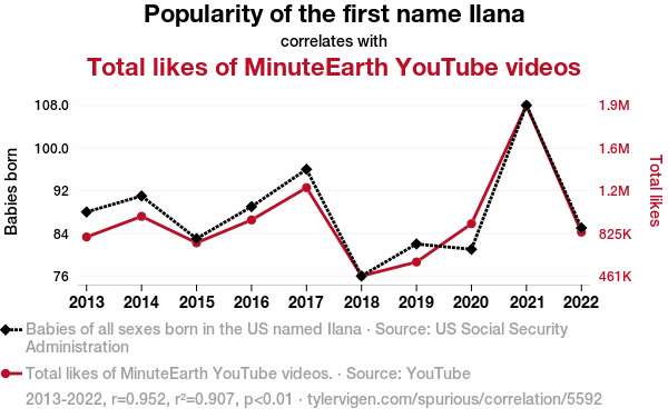 - The spurious research paper: The Ilana Effect: A Statistical Analysis of the Correlation Between the Popularity of the Name Ilana and the Total Likes of MinuteEarth YouTube Videos