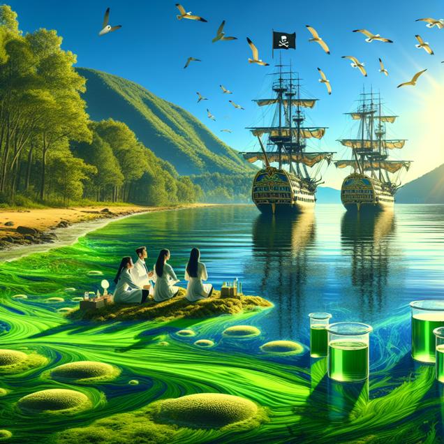 ChatGPT: A clear, sunny day in Roanoke, Virginia, with blue skies and lush green trees. The air is noticeably cleaner as new eco-friendly algae, greenbeardicus, begins to spread throughout the nearby ocean waters. A group of pirate ships, identifiable by their iconic Jolly Roger flags, approach the coastline but suddenly halt as they encounter the scent of the greenbeardicus, visibly repelled and unable to proceed. Scientists stand perplexed, marveling at the unexpected but effective defense against pirate attacks provided by the flourishing algae.