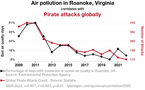 A linear line chart with years as the X-axis and two variables on the Y-axis. The first variable is Air pollution in Roanoke, Virginia and the second variable is Pirate attacks globally.  The chart goes from 2009 to 2022, and the two variables track closely in value over that time. Small Image