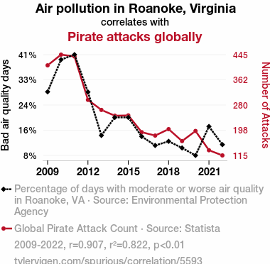 This means 82.2% of the change in the one variable (i.e., Pirate attacks globally) is predictable based on the change in the other (i.e., Air pollution in Roanoke, Virginia) over the 14 years from 2009 through 2022.