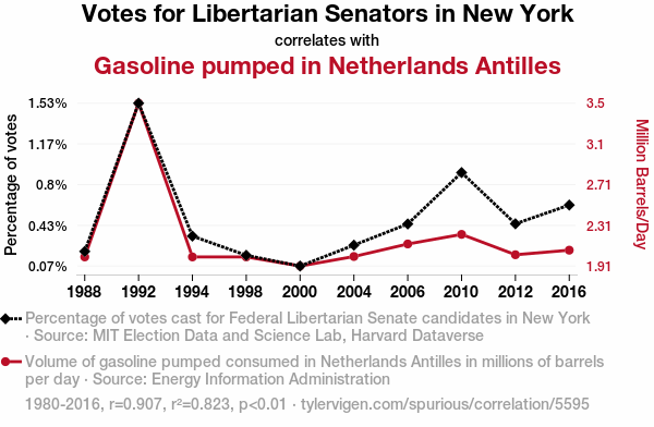 Libertarian votes, Senators, New York, Gasoline, Netherlands Antilles, correlation, Republicans, Democrats, political ideologies, international energy consumption, MIT Election Data and Science Lab, Harvard Dataverse, Energy Information Administration, statistics, research, petroleum industry