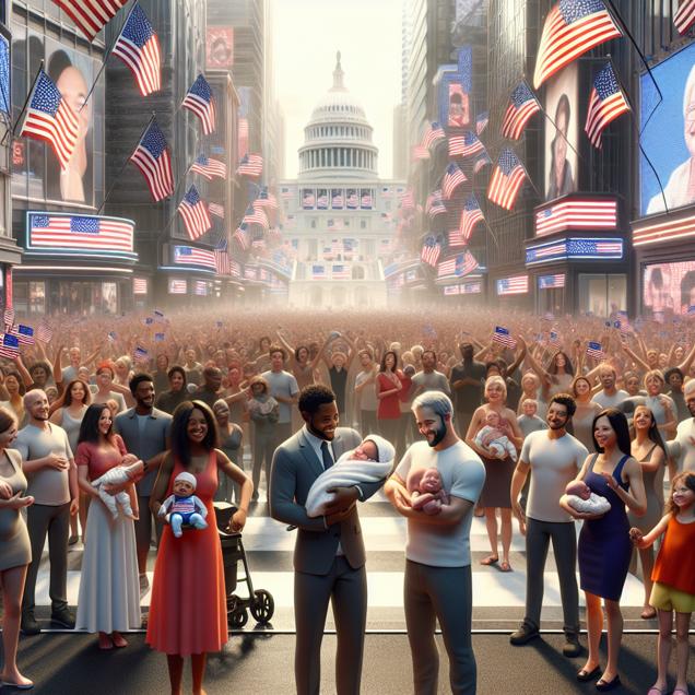 Prompt: Generate an image of a futuristic bustling street in Washington, D.C., filled with a diverse crowd of parents holding personalized mini American flags, waving them proudly. In the midst of the crowd, a group of new parents joyfully presents their newborn baby named Ezequiel, also holding the same mini American flag. In the background, a large banner prominently displays strong support for the Democratic Presidential candidate. Capture the energy of the scene and the growing popularity of the name Ezequiel, as well as the increasing support for the Democratic candidate, symbolized by the waving mini American flags in Washington. The depiction should include only scenes, people, and objects, it should not include text or speech bubbles.