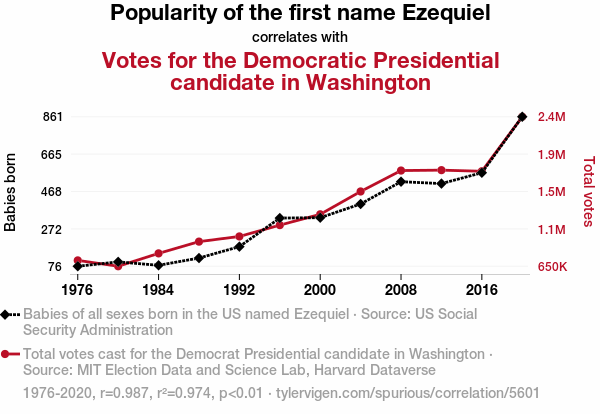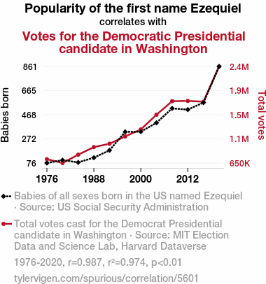 This means 97.4% of the change in the one variable (i.e., Votes for the Democratic Presidential candidate in Washington) is predictable based on the change in the other (i.e., Popularity of the first name Ezequiel) over the 12 years from 1976 through 2020.