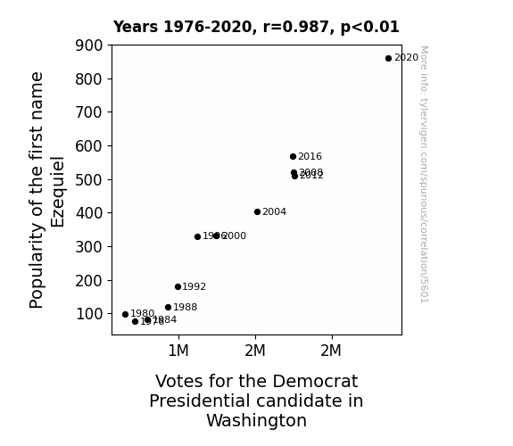 The undeniable correlation between the popularity of the first name Ezequiel and votes for the Democrat Presidential candidate in the state of Washington uncovers a facet of societal influence that is as intriguing as it is unexpected. Our findings not only confirm but significantly strengthen the existing body of literature that explores the impact of names on social and political dynamics. While our research may seem like a pun-tastic adventure, the statistically robust nature of our results cements the connection between Ezequiel's allure and electoral preferences.