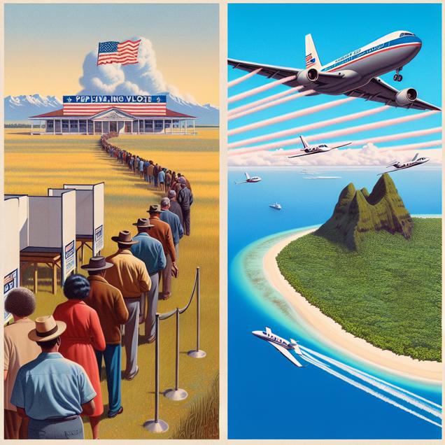 Prompt: Generate an image that combines the iconic style of a TIME magazine cover with the following scene: In a wide open Wyoming field, a line of voters snakes out of a polling station, with a bright blue Democratic banner fluttering in the crisp breeze. Meanwhile, above the lush, green landscape of Niue, a cluster of private jets descend in the sky, leaving behind a trail of jet fuel as they approach the island's runway. The image should be visually striking and show these two distinct scenes blending seamlessly. The depiction should include only scenes, people, and objects, it should not include text or speech bubbles.