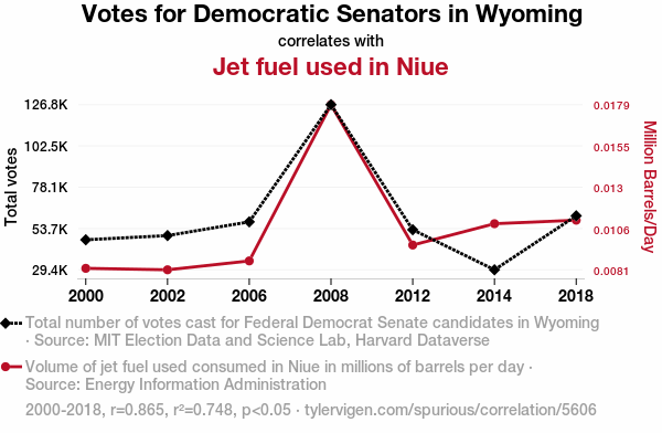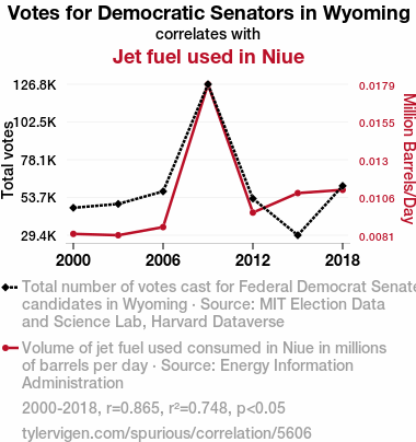 This means 74.8% of the change in the one variable (i.e., Jet fuel used in Niue) is predictable based on the change in the other (i.e., Votes for Democratic Senators in Wyoming) over the 7 years from 2000 through 2018.