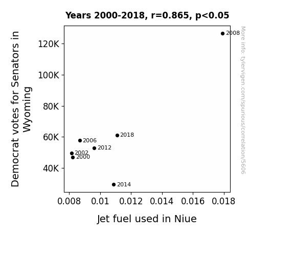 The results of the analysis revealed a significant positive correlation between the number of Democrat votes for Senators in Wyoming and the quantity of jet fuel utilized in Niue from 2000 to 2018. The correlation coefficient of 0.8650622 indicates a strong positive linear relationship between the two variables, resembling a statistical bromance that defies geographical distance and political affiliations. It seems that even in the realm of statistical analysis, opposites attract – much like the magnetic poles of a research magnet.